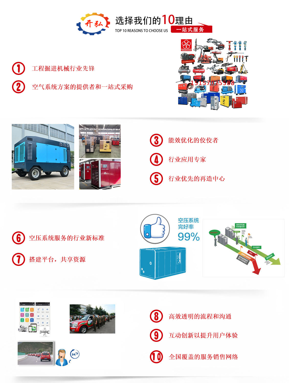 ? ? ? ? 我公司始終堅(jiān)持紅五環(huán)經(jīng)營(yíng)戰(zhàn)略,堅(jiān)持中高端品牌空壓機(jī)、鉆機(jī)的經(jīng)營(yíng)發(fā)展思路 ,專業(yè)于品牌空壓機(jī)、鉆機(jī)的銷售與維修服務(wù),并提供空壓機(jī)、鉆機(jī)維修及零備件供應(yīng)(鉆桿,鉆頭,沖擊器等鉆機(jī)配件;空氣濾芯、機(jī)油濾芯、油氣分離器、專用潤(rùn)滑油、冷卻液……